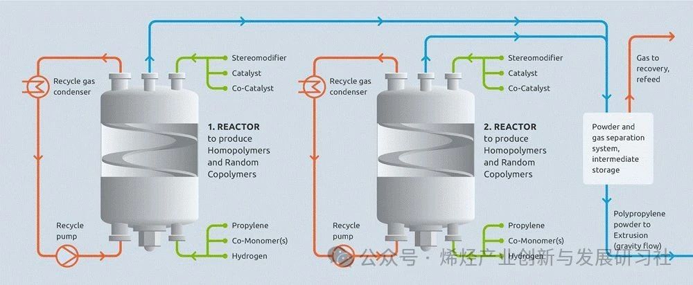 鼎际得成立于2004年,公司主要产品为高效催化剂、抗氧剂单剂和复合助剂。2024年半年报显示,公司致力于为高分子材料行业提供专业化、定制化的产品,是国内少数同时具备高分子材料高性能催化剂和化学助剂产品的专业提供商。经过20年的发展,公司形成了聚烯烃高性能催化剂和化学助剂的研发、生产和销售为一体的业务体系,致力于为高分子材料行业提供专业化、定制化的产品和服务。 市场分析人士认为,鼎际得核心业务持续发力,海外客户不断增多,如与鲁姆斯合作正常履约锁定营收或将对公司基本盘稳健起到关键作用,同时,有利于公司正在投建的POE项目的稳步推进,在高端新材料业务上谋突破,逐步构建起多元增长的业务格局。 巴斯夫于1962 年首次开发了Novolen 聚丙烯技术,鲁姆斯于2000 年收购了该技术。鲁姆斯技术公司的Novolen®技术以齐格勒-纳塔和茂金属催化剂为基础,在全球范围内许可气相聚丙烯生产工艺,以生产各种聚丙烯树脂。该技术高度灵活、稳健、节能,可生产所有产品系列的全范围的领先的聚丙烯产品,包括均聚物、无规共聚物、三元共聚物、抗冲共聚物和 rTPO。 Novolen的气相法工艺采用一台或两台相同的立式气相搅拌床反应器。均聚物和无规共聚物可以在单台反应器中或在串联的两台反应器中生产,具体配置取决于所需的产能和产品范围。或者,可以将两台反应器并联运行,以达到单个装置的更高产能,并可生产双峰树脂产品。生产抗冲共聚物需要两台反应器串联配置,在第一台反应器中,聚合产生丙烯均聚物(或无规共聚物)基体,在第二台反应器中,生产乙烯-丙烯橡胶(EPR)。与反应器串联或并联的配置无关,所有反应器的设计,尺寸和材料均相同。 其简化的NOVOLEN工艺流程如下: 反应器并联配置(生产均聚物和无规共聚物): 反应器串联配置(生产均聚物、无规共聚物和抗冲共聚物: 文章来源:鼎际得、烯烃产业创新与发展研习社编辑整理
