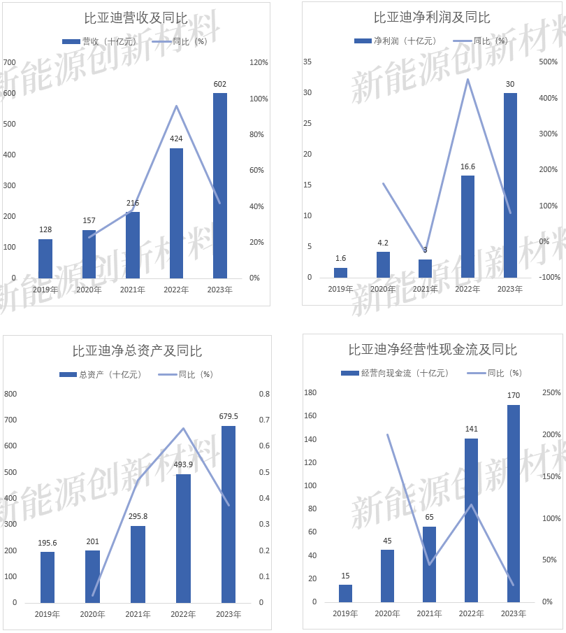根据数据统计显示,2023年,比亚迪营业收入约为6020亿元,同比增加42%,净利润约为300亿元,同比增加81%,经营性现金流约为170亿元,同比增加216795%;截止到2023年年末,宁德时代总资产为7172亿元,同比增加38%。
