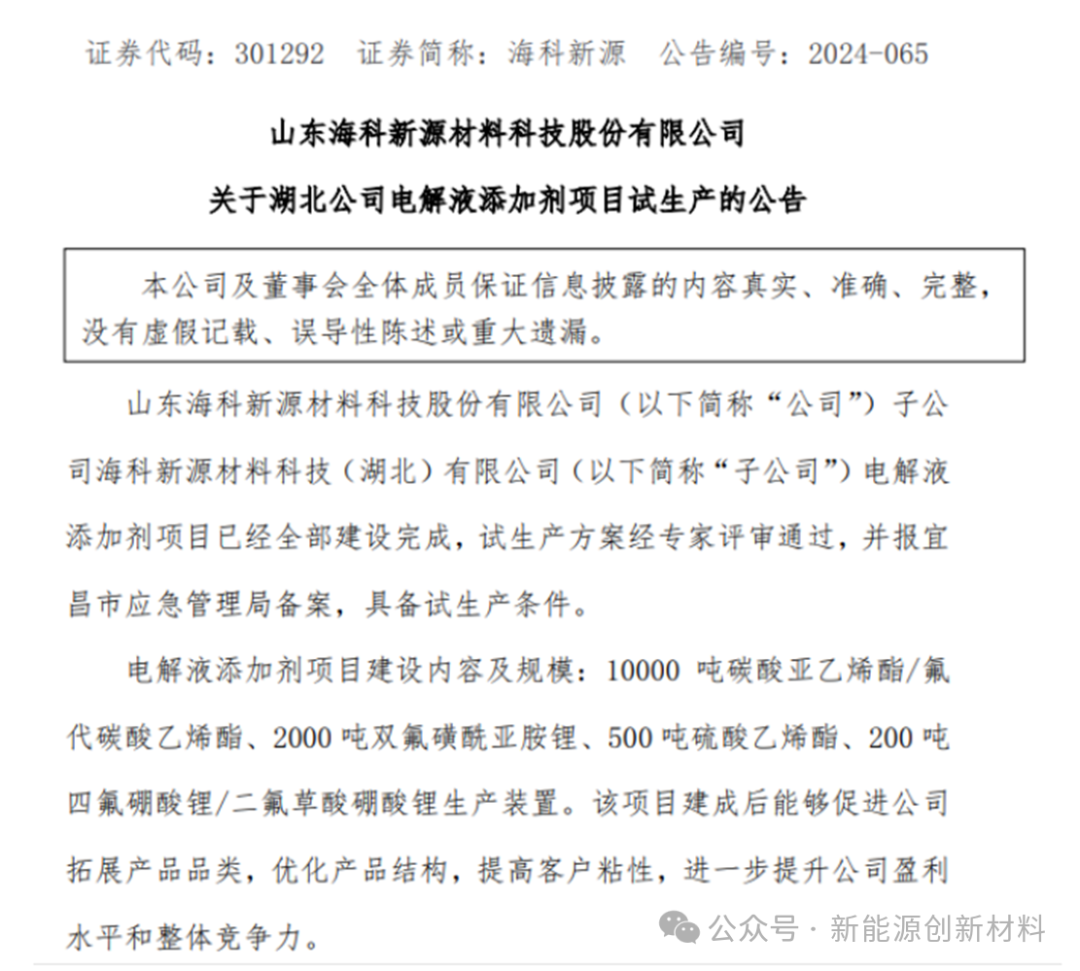 海科新源(301292)10月9日晚间公告,公司子公司海科新源材料科技(湖北)有限公司电解液添加剂项目已经全部建设完成,试生产方案经专家评审通过,并报宜昌市应急管理局备案,具备试生产条件。