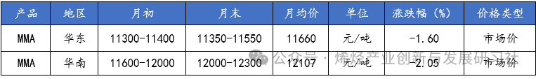 11月MMA——PMMA产业链月报 1 MMA——PMMA产业链月度价格盘点 表1 MMA——PMMA产业链月度价格汇总表 2