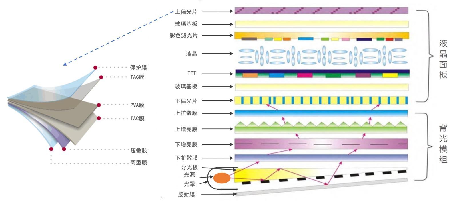 光学膜是一种由薄的分层介质构成的,均匀地附着在光学器件表面的光学介质材料,其通过界面传播光束时光波的反射、透射、偏振等特性来达到反射、增透、分光、滤光或改变光束偏振态等效果,从而满足人们所需的光学功能。光学膜的基本功能分别是反射、减反射和光谱调控,其中反射功能可使光线按不同角度折转到空间的各个方向,减反射功能可将光线在反射时的损耗降到最低,光谱调控功能则可以使光学系统中的色度进行变换从而获得绚丽的色彩。根据功能不同,光学膜可分为反射膜、偏光片、扩散膜、增亮膜和滤光片等,其中彩色滤光片、偏光片以及扩散膜和增亮膜所构成的背光模组都是TFT-LCD的重要组成部分。(见图1)。 狭义上,光学膜可分为LCD液晶面板用光学膜和LCD背光模组用光学膜。LCD面板主要由液晶面板和背光模组构成。由于液晶面板本身不具备发光特性,需要在液晶面板上增加背光模组作为发光源。LCD每个液晶面板中的光学膜包含2张偏光片、2张配向膜以及1张彩色滤光片。LCD每个背光模组中的光学膜包含2张增亮膜、2张扩散膜、1张反射膜(见图2)。本文主要针对显示领域的LCD面板用光学膜进行介绍。 我国光学膜行业起步较晚,迄今仅二十多年的发展历史,产品结构主要集中在中低端,与国外企业尚有一定差距。自“十二五”以来,光学膜作为新型显示材料受到了国家多项政策的支持和鼓励,同时在此期间,我国对光学膜产业的引导方向主要为提升自主研发和提升国产率,如在《新型显示科技发展“十二五”规划》中提到,将加快光学膜关键技术的自主研发和国产化导入列为发展重要方向,因此我国光学膜产业的自有技术在“十二五”时期愈发成熟,国内企业的光学膜布局犹如雨后春笋般出现;从“十三五”至今,我国光学膜行业的发展方向不仅需要提高国产化率,还要向更高端化前进,如《能源技术创新“十三五”规划》提出需研发新一代光伏背板基膜材料,在《重点新材料首批次应用示范指导目录(2019年版)》中将复合膜、偏光片列入首批应用保险补偿试点工作范围。 现阶段,中国光学膜行业处在国产化配套的快速发展时期,得益于下游LCD面板出货量稳定增长,中国光学膜行业市场空间仍然会持续增长。本文对光学膜行业市场规模的估算值主要包含背光模组用光学膜和偏光片两部分。根据对行业内有14年光学膜市场销售经验的专家访谈得知:光学膜行业市场规模的扩张与LCD面板年产出面积有同步效应,LCD面板行业增速会直接影响到光学膜行业整体增速。2021年,全球光学膜市场总规模达到1624.49亿元(人民币),中国光学膜市场规模达到498.56亿元(人民币),并占全球光学膜市场总份额的30.69%。在2021-2027预测期间内,预计光学膜市场将以6.87%的复合年增长率稳步增长,预计在2027年全球光学膜市场总规模将会达到2410.99亿元。具体而言,光学膜行业市场未来将持续增长,受如下三方面因素驱动:- 下游市场需求仍有增长空间。中国已经成为最大的消费电子产品生产国,随着中国人均收入水平的不断提高,消费者对液晶电视、手机、电脑等消费类电子产品品质要求不断提升,更新换代频率加快,需求依然强劲。带动液晶面板行业产能现阶段扩张,提升对显示用光学膜等原材料的市场需求数量。