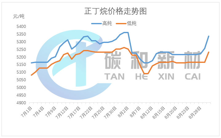 本月山东高纯正丁烷出厂价月平均价格为5230.68元/吨,较上月下跌0.58%,主流价格从本月初(8.1)5300-5420元/吨变动至本月末(8.30)5280-5390元/吨。 本月山东低纯正丁烷出厂价月平均价格为5170.45元/吨,较上月下跌0.46%,主流价格从本月初(8.1)5220-5300元/吨变动至本月末(8.30)5210-5250元/吨。 8月正丁烷市场先下跌,后盘整回升,月底探涨。8月CP出台小涨,但是下游需求低迷,顺酐厂家持续亏损选择降负停工,上旬正丁烷价格下探。随着价格走低,对比混丁优势明显,下有采购增加,加上外盘走强影响,正丁烷反弹回升,不过下游形势未有好转,正丁烷市场回涨有限,市场博弈下弱稳运行,月底因9月CP出台上涨带动,正丁烷市场上涨。