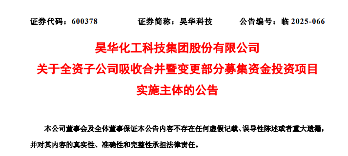 近日,昊华化工科技集团股份有限公司发布关于全资子公司吸收合并暨变更部分募集资金投资项目实施主体的公告。